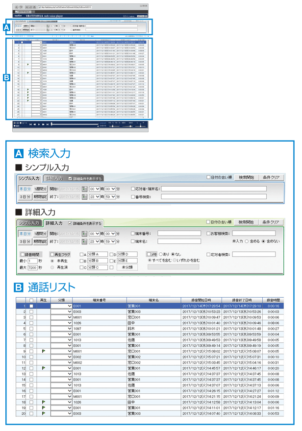 | 検索項目 | 日時/端末番号/端末名/お客様検索/応対者検索/録音時間/再生フラグ/分類/メモ | |